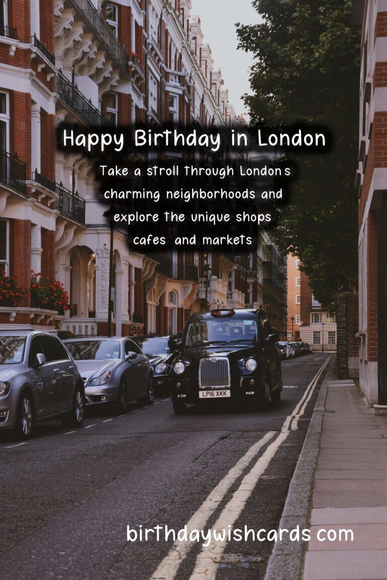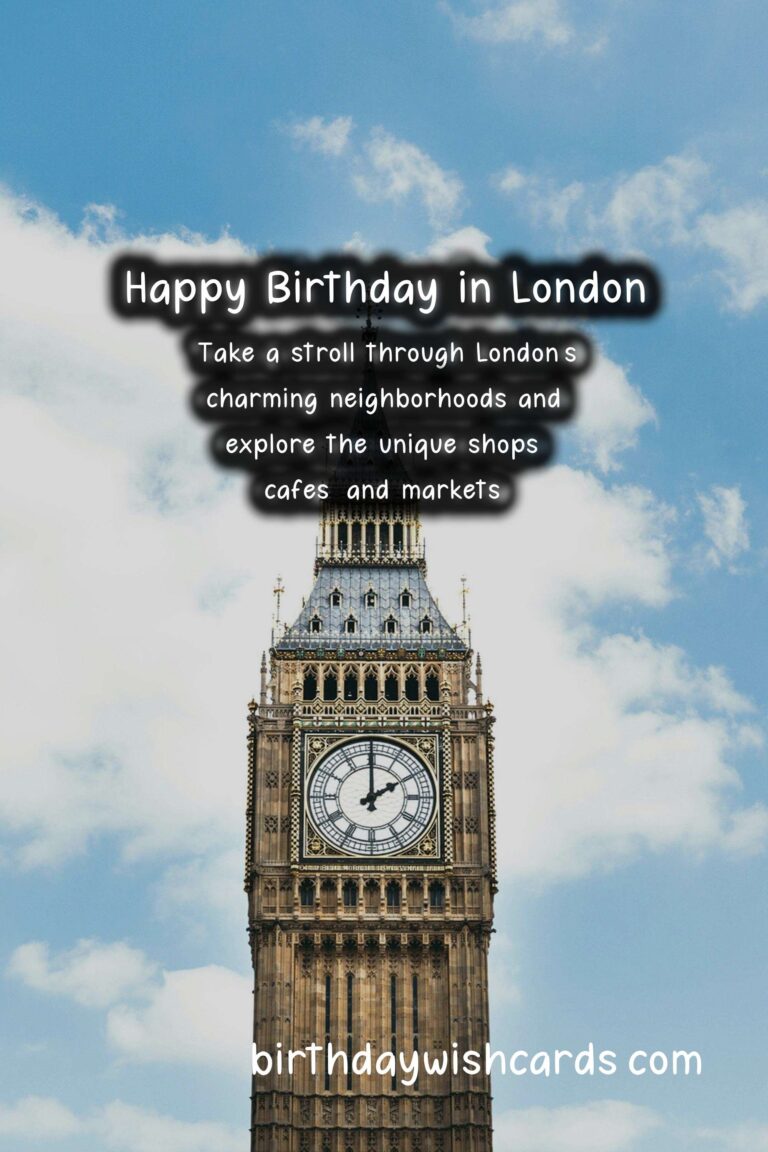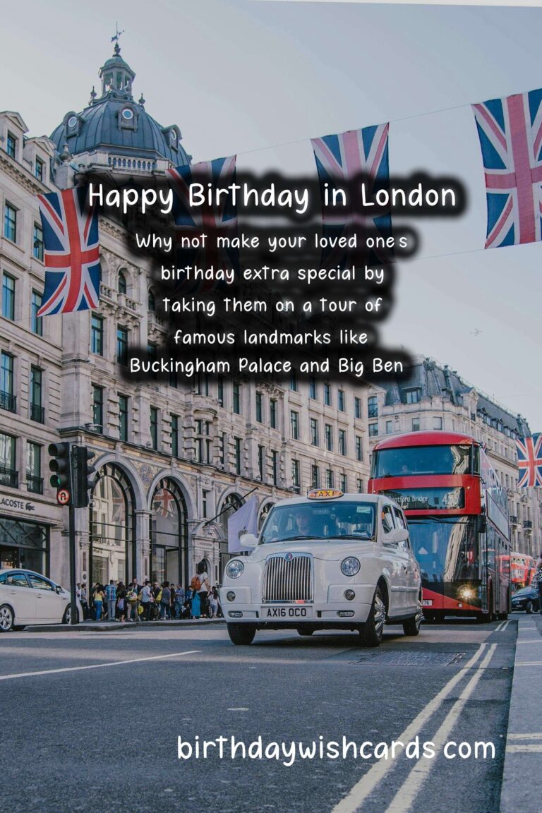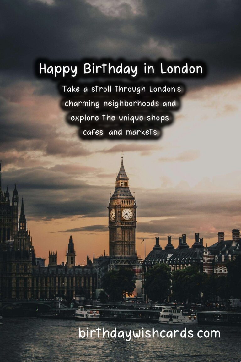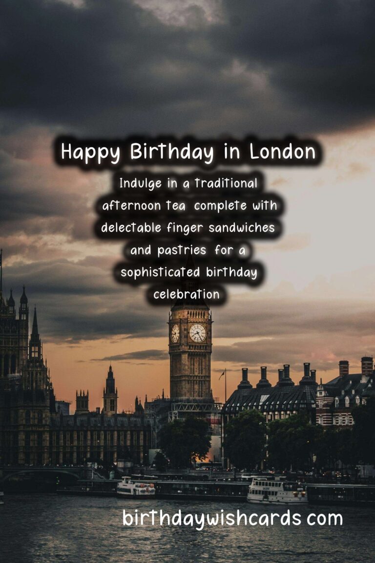 This year, make your loved one’s birthday one to remember with London birthday wishes! From walking through the charming streets of Notting Hill to enjoying a traditional afternoon tea, there are plenty of ways to make your loved one’s birthday in London unforgettable. Why not make your loved one’s birthday extra special by taking them on a tour of famous landmarks like Buckingham Palace and Big Ben? Indulge in a traditional afternoon tea, complete with delectable finger sandwiches and pastries, for a sophisticated birthday celebration. Take a stroll through London’s charming neighborhoods and explore the unique shops, cafes, and markets. Surprise your loved one with tickets to a top-notch West End show and make it a night to remember. London is a city filled with timeless elegance, making it the perfect place for a birthday celebration.