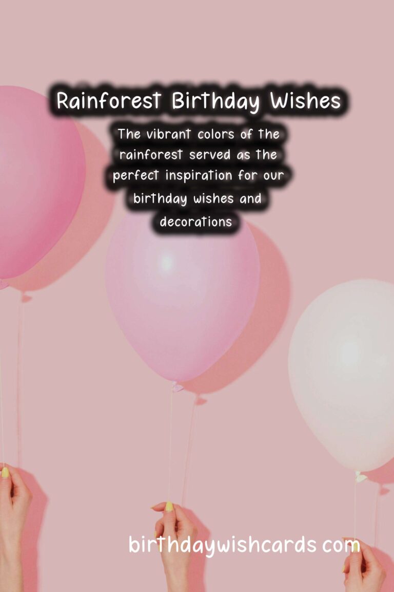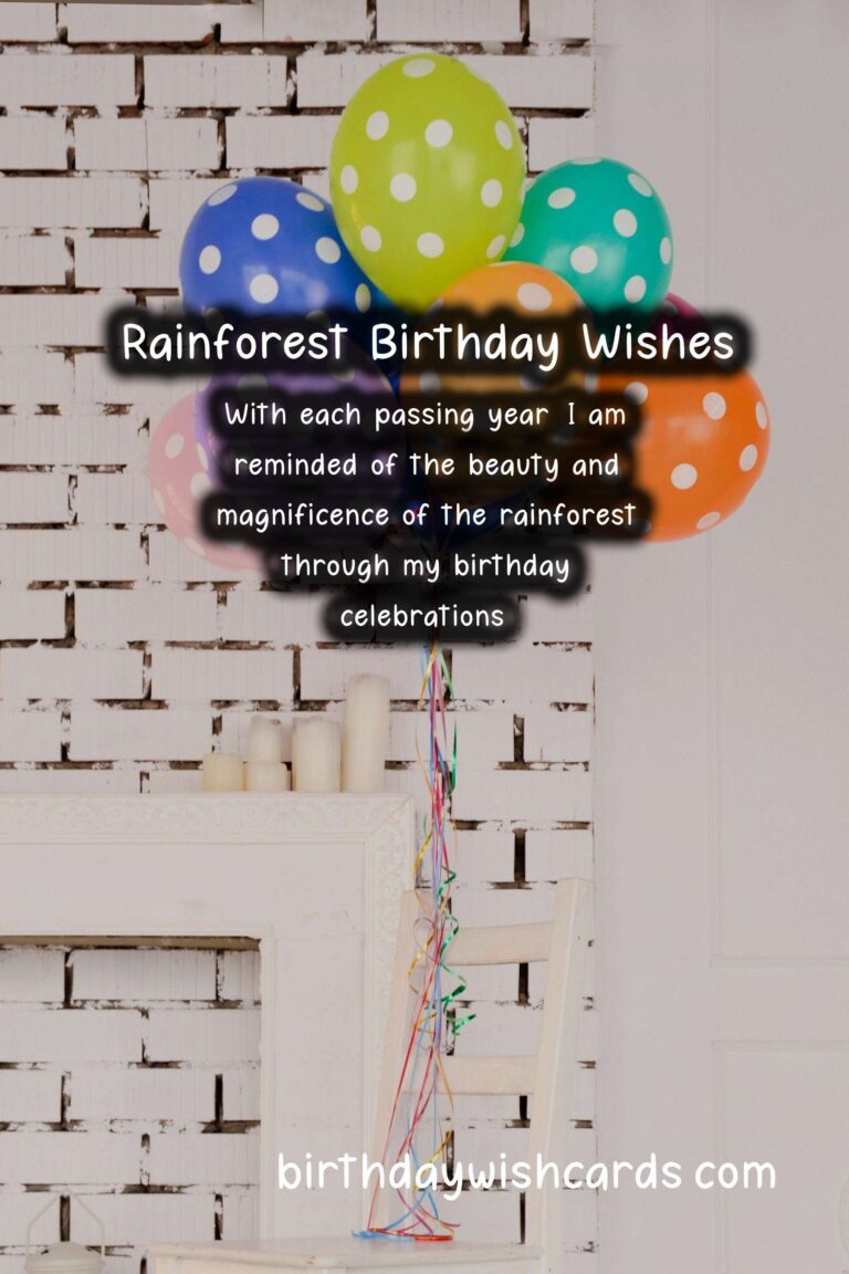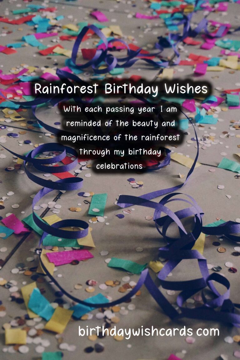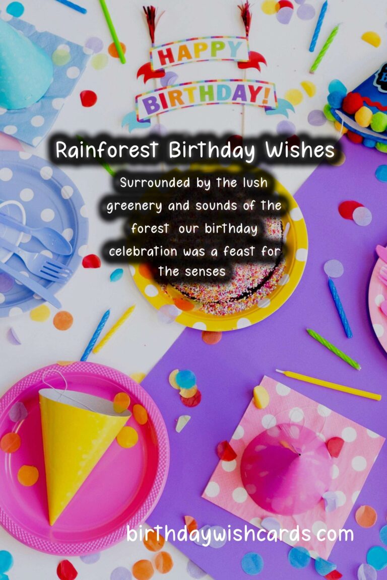 Rainforests are rich in natural beauty and vibrant with life, making it the perfect setting for a birthday celebration. From colorful flora and fauna to majestic waterfalls and towering trees, the rainforest provides a unique and unforgettable backdrop for any birthday gathering. Here are a few sentences that capture the essence of a rainforest birthday party and wishes that are sure to make the celebration even more special. Surrounded by the lush greenery and sounds of the forest, our birthday celebration was a feast for the senses. As the sun peeked through the leaves and illuminated our festivities, we couldn’t help but feel grateful for another year of life. The vibrant colors of the rainforest served as the perfect inspiration for our birthday wishes and decorations. From toucans and macaws to butterflies and monkeys, the rainforest animals added an extra touch of wonder to our celebration. The bountiful fruits and vegetation of the rainforest provided a mouthwatering menu for our guests, with flavors and aromas unlike anything we’ve ever tasted. Amidst the festivities, we couldn’t help but pause and reflect on the importance of preserving these lush and diverse ecosystems for future generations. With each passing year, I am reminded of the beauty and magnificence of the rainforest through my birthday celebrations. I can’t think of a better way to celebrate my birthday than surrounded by the sights and sounds of this rich and vibrant landscape. As we blew out our candles and made our birthday wishes, the rainforest whispered promises of adventure, mystery, and a life filled with wonder. With the rainforest as our playground and the stars as our ceiling, we danced the night away in celebration of another year of life.