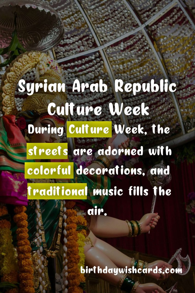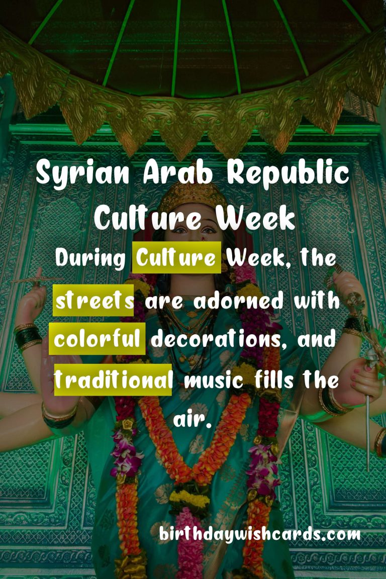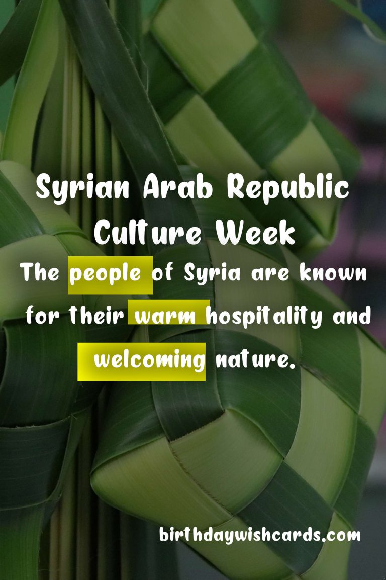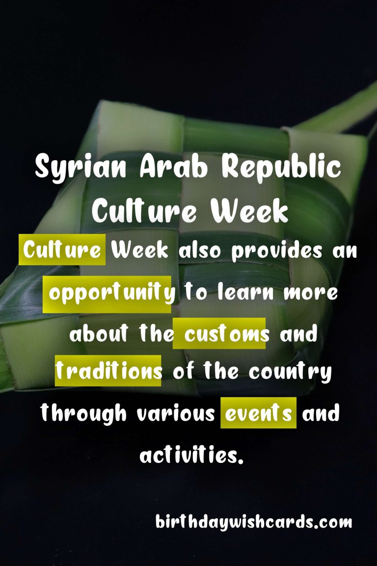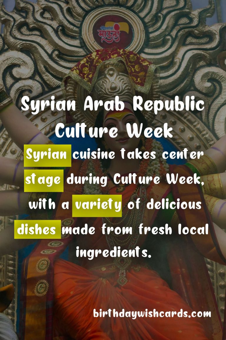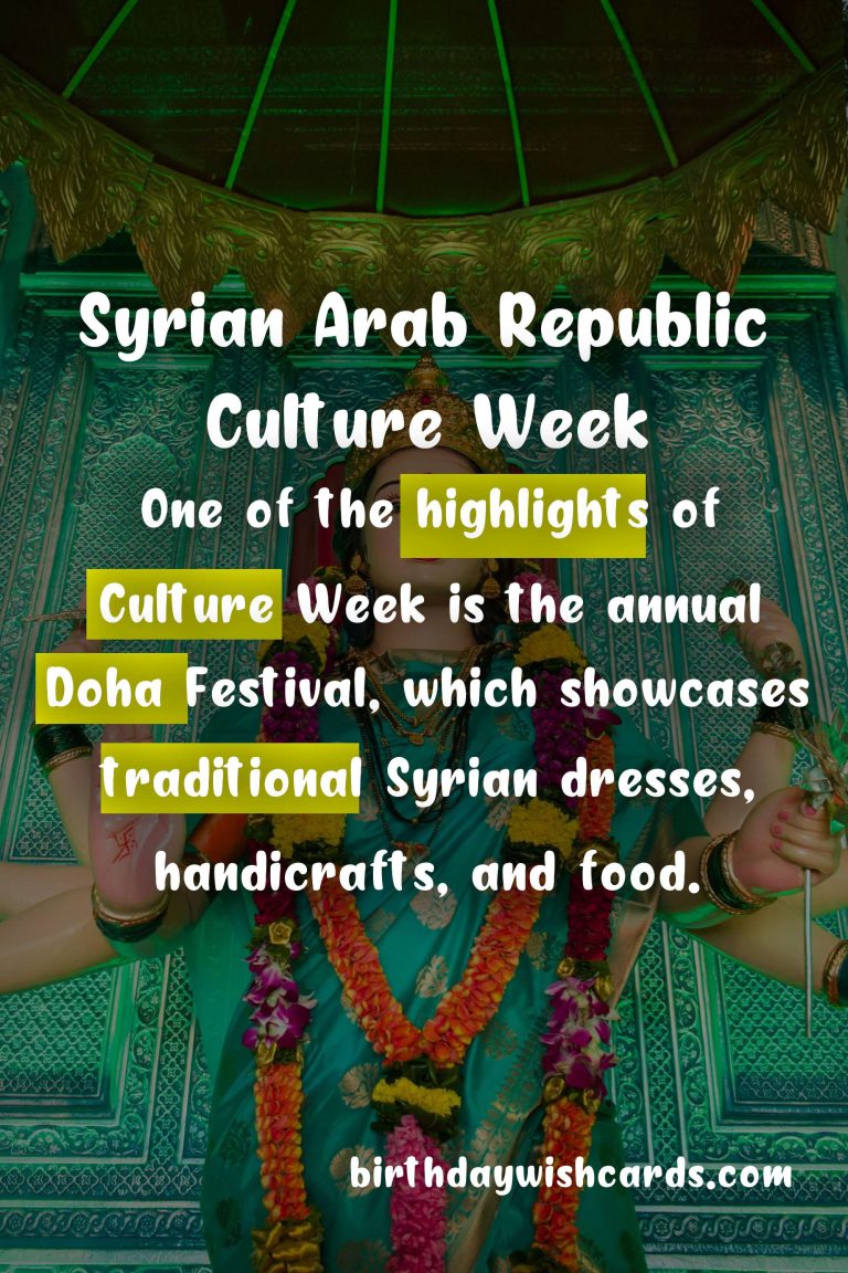 Syrian Arab Republic Culture Week is a time to celebrate and appreciate the diverse and vibrant culture of the country. The history of the Syrian Arab Republic is a tapestry of different cultural influences, evident in its architecture, food, and customs. During Culture Week, the streets are adorned with colorful decorations, and traditional music fills the air. One of the highlights of Culture Week is the annual Doha Festival, which showcases traditional Syrian dresses, handicrafts, and food. Syrian cuisine takes center stage during Culture Week, with a variety of delicious dishes made from fresh local ingredients. The people of Syria are known for their warm hospitality and welcoming nature. Culture Week also provides an opportunity to learn more about the customs and traditions of the country through various events and activities.