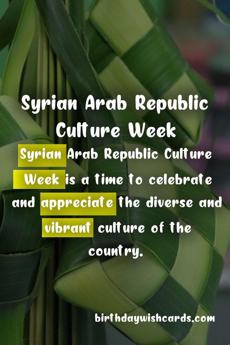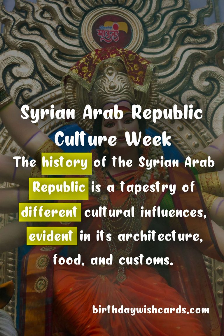 The Syrian Arab Republic is a country located in Western Asia, bordered by Lebanon, Israel, Jordan, Iraq, and Turkey. It has a long and rich history, with a cultural heritage that dates back millennia. The country is known for its breathtaking landscapes, mouth-watering cuisine, and warm hospitality. From October 1st to 7th, people all over the world celebrate Syrian Arab Republic Culture Week, a time to honor and appreciate the diverse and vibrant culture of this beautiful country.
