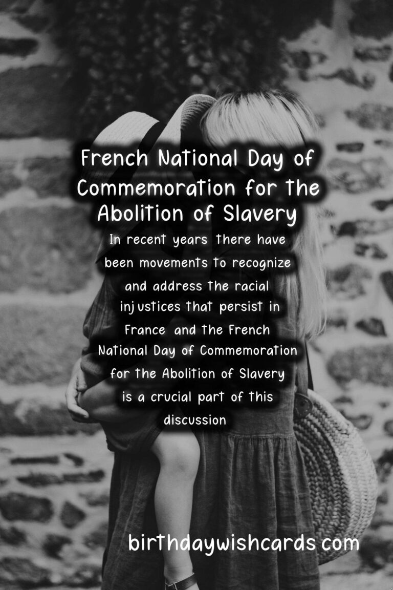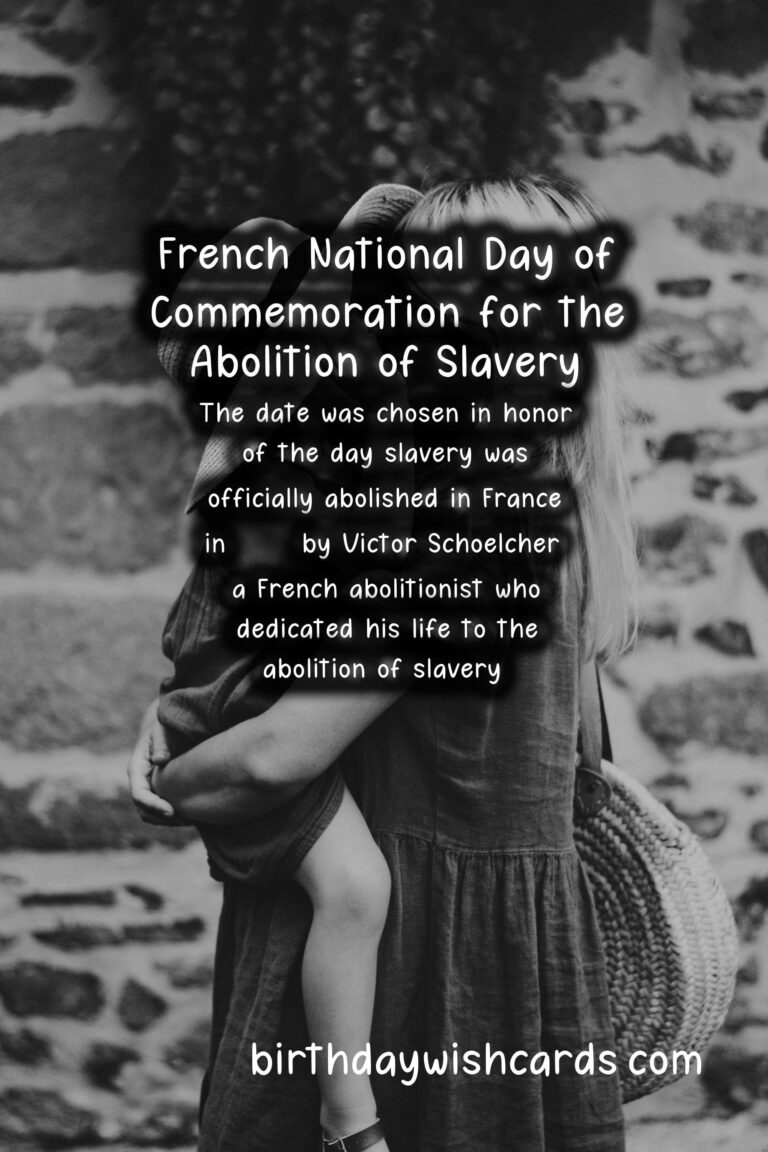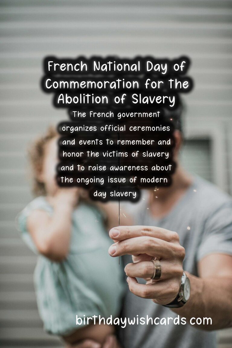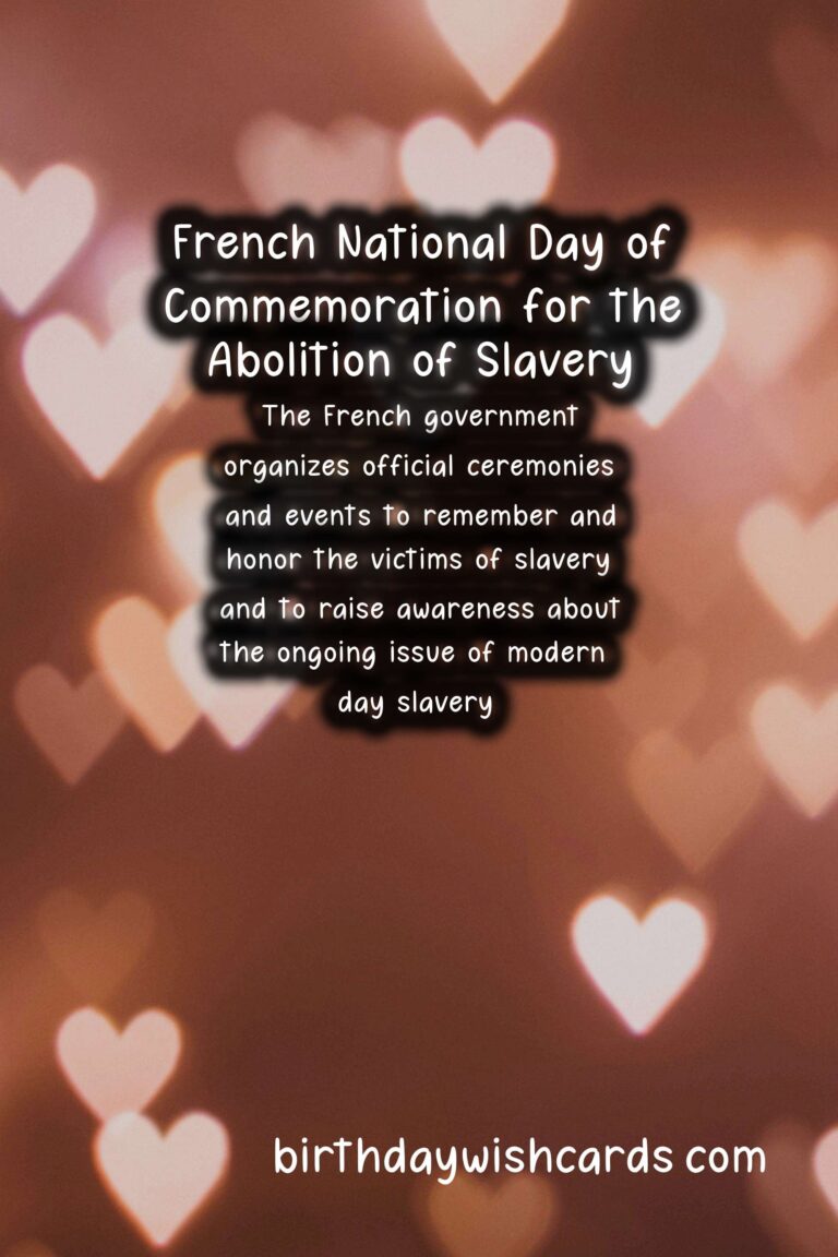 The French National Day of Commemoration for the Abolition of Slavery is a day dedicated to remembering and paying tribute to the victims of slavery and those who fought tirelessly to abolish it. It is observed on May 10th each year in France, and is a significant event in the country’s history. This day is a reminder of the atrocities and injustices of the past, while also highlighting the ongoing fight against modern-day forms of slavery. On May 10th, 2001, the French government officially recognized the transatlantic slave trade and slavery as crimes against humanity, and decreed that May 10th would be a national day of remembrance. The date was chosen in honor of the day slavery was officially abolished in France in 1848 by Victor Schoelcher, a French abolitionist who dedicated his life to the abolition of slavery. The French National Day of Commemoration for the Abolition of Slavery is not only a day of remembrance, but also serves as a time for reflection and education on the dark history of slavery and the lasting impact it has had on society. It is a day to acknowledge the resilience and strength of those who were enslaved and to honor those who fought for their freedom. The French government organizes official ceremonies and events to remember and honor the victims of slavery, and to raise awareness about the ongoing issue of modern-day slavery. One of the most significant events on this day is the wreath laying ceremony at the Jardin des Plantes in Paris, where a memorial was built in 2007 to honor victims of slavery. The ceremony is attended by government officials, activists, and members of the public, and serves as a powerful reminder of the impact of slavery on society as a whole. Another important aspect of this day is the recognition of the role of France in the transatlantic slave trade, as well as the acknowledgement of the ongoing struggles faced by people of African descent in France. In recent years, there have been movements to recognize and address the racial injustices that persist in France, and the French National Day of Commemoration for the Abolition of Slavery is a crucial part of this discussion. It is a day to stand in solidarity with those who continue to face discrimination and to commit to working towards a more just and equal society. The French National Day of Commemoration for the Abolition of Slavery is not only observed in France, but also in French territories such as Guadeloupe, Martinique, and French Guiana, where the impact of slavery is still felt today. Through education and remembrance, this day serves as a powerful reminder of the collective responsibility to fight against all forms of oppression and to create a more inclusive and equitable world for all. As we commemorate the French National Day of Commemoration for the Abolition of Slavery, let us remember and honor the victims, and continue the fight against modern-day slavery and other forms of injustice.