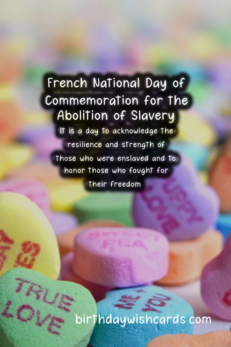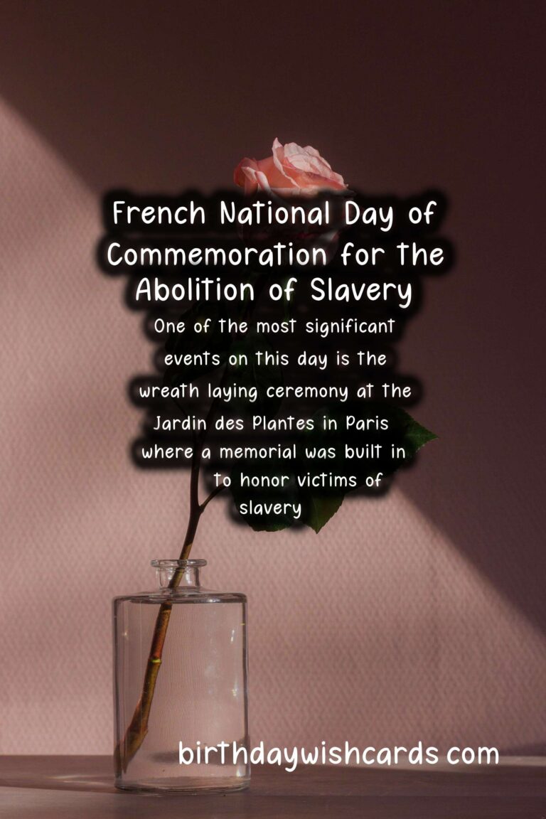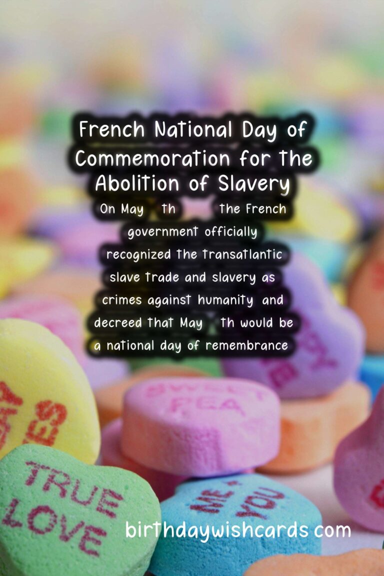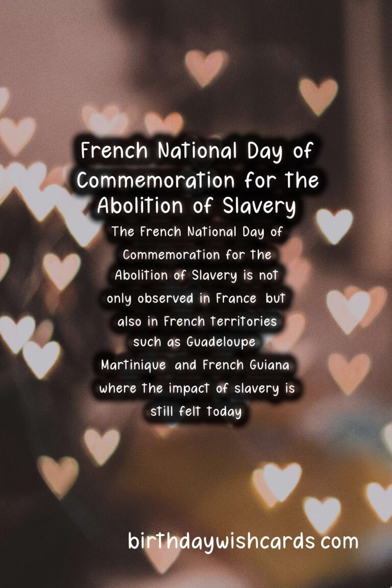 The French National Day of Commemoration for the Abolition of Slavery is a day dedicated to remembering and paying tribute to the victims of slavery and those who fought tirelessly to abolish it. It is observed on May 10th each year in France, and is a significant event in the country’s history. This day is a reminder of the atrocities and injustices of the past, while also highlighting the ongoing fight against modern-day forms of slavery. On May 10th, 2001, the French government officially recognized the transatlantic slave trade and slavery as crimes against humanity, and decreed that May 10th would be a national day of remembrance. The date was chosen in honor of the day slavery was officially abolished in France in 1848 by Victor Schoelcher, a French abolitionist who dedicated his life to the abolition of slavery. The French National Day of Commemoration for the Abolition of Slavery is not only a day of remembrance, but also serves as a time for reflection and education on the dark history of slavery and the lasting impact it has had on society. It is a day to acknowledge the resilience and strength of those who were enslaved and to honor those who fought for their freedom. The French government organizes official ceremonies and events to remember and honor the victims of slavery, and to raise awareness about the ongoing issue of modern-day slavery. One of the most significant events on this day is the wreath laying ceremony at the Jardin des Plantes in Paris, where a memorial was built in 2007 to honor victims of slavery. The ceremony is attended by government officials, activists, and members of the public, and serves as a powerful reminder of the impact of slavery on society as a whole. Another important aspect of this day is the recognition of the role of France in the transatlantic slave trade, as well as the acknowledgement of the ongoing struggles faced by people of African descent in France. In recent years, there have been movements to recognize and address the racial injustices that persist in France, and the French National Day of Commemoration for the Abolition of Slavery is a crucial part of this discussion. It is a day to stand in solidarity with those who continue to face discrimination and to commit to working towards a more just and equal society. The French National Day of Commemoration for the Abolition of Slavery is not only observed in France, but also in French territories such as Guadeloupe, Martinique, and French Guiana, where the impact of slavery is still felt today. Through education and remembrance, this day serves as a powerful reminder of the collective responsibility to fight against all forms of oppression and to create a more inclusive and equitable world for all. As we commemorate the French National Day of Commemoration for the Abolition of Slavery, let us remember and honor the victims, and continue the fight against modern-day slavery and other forms of injustice.