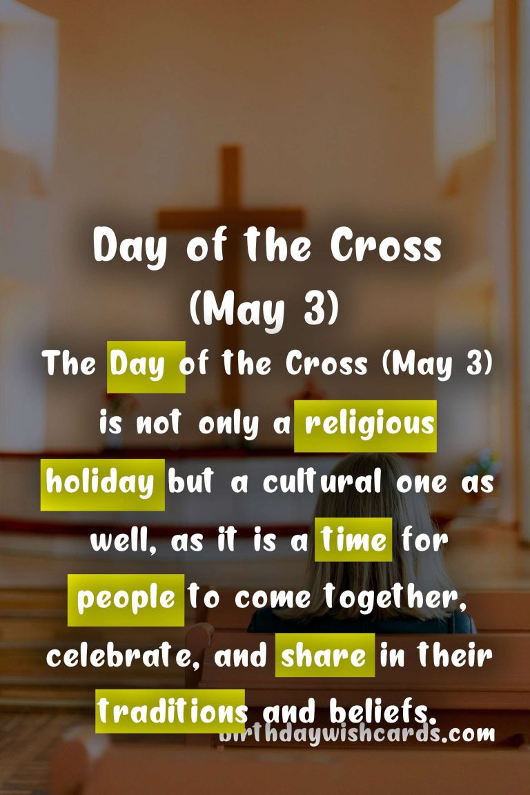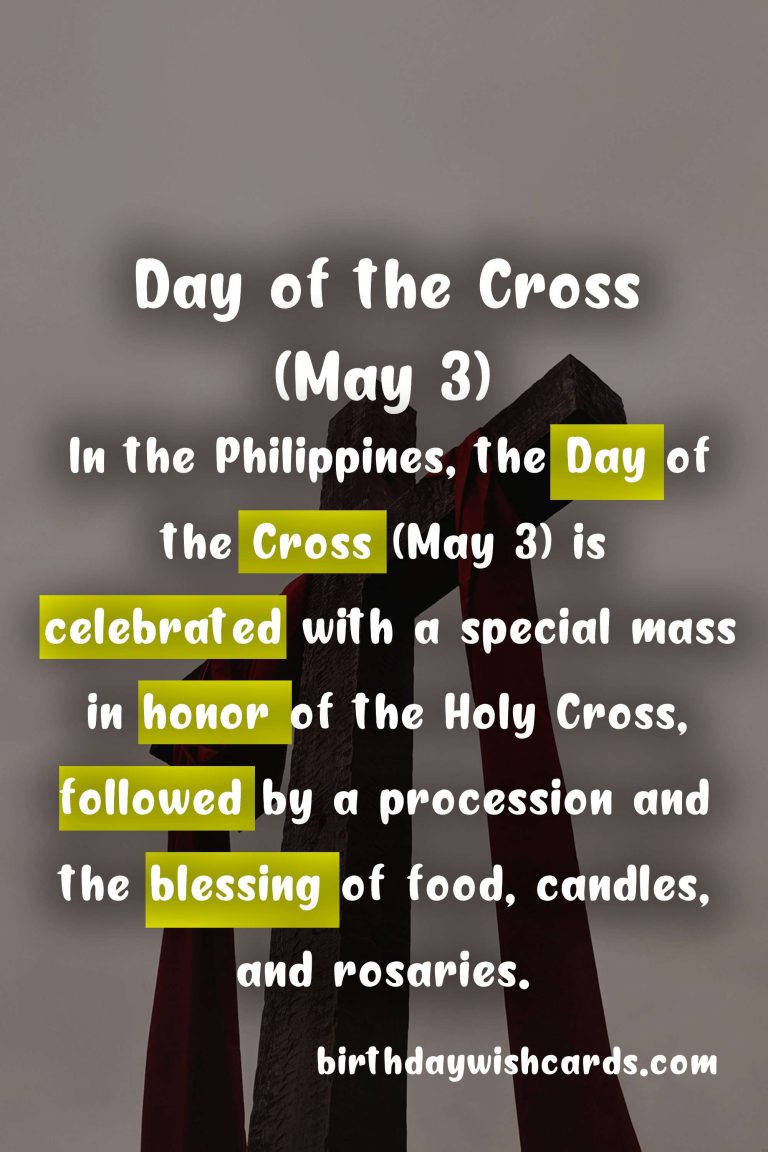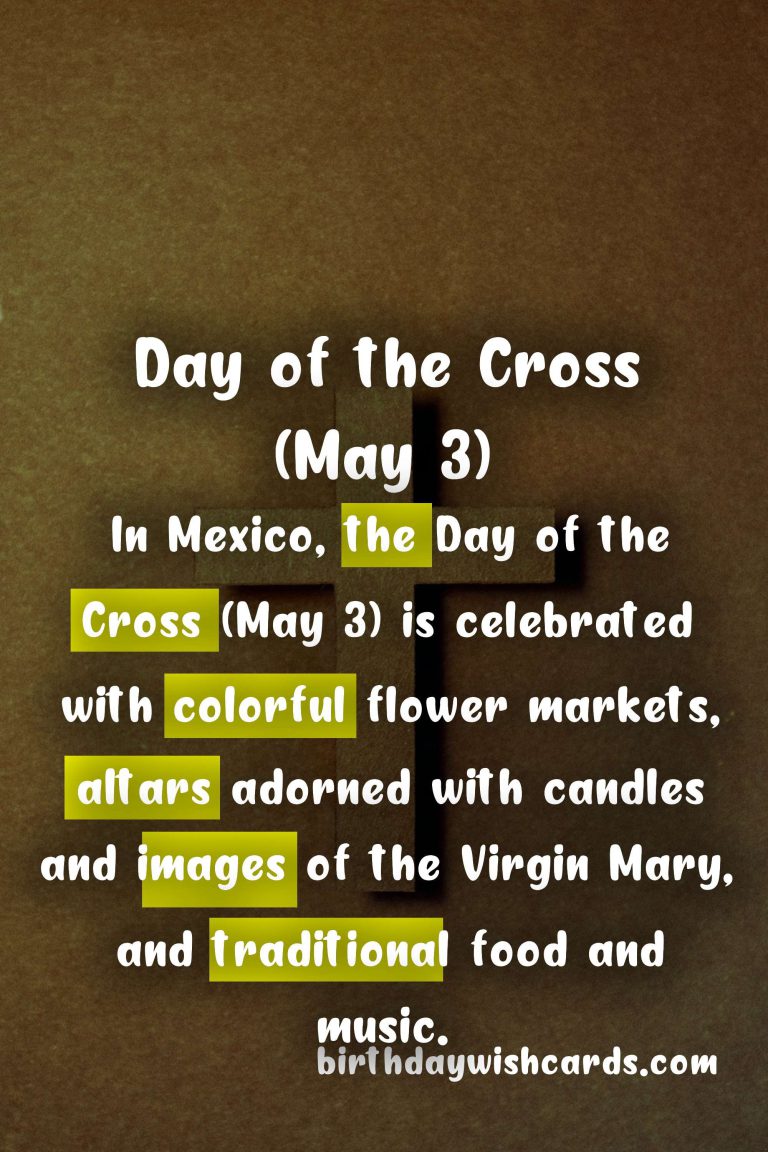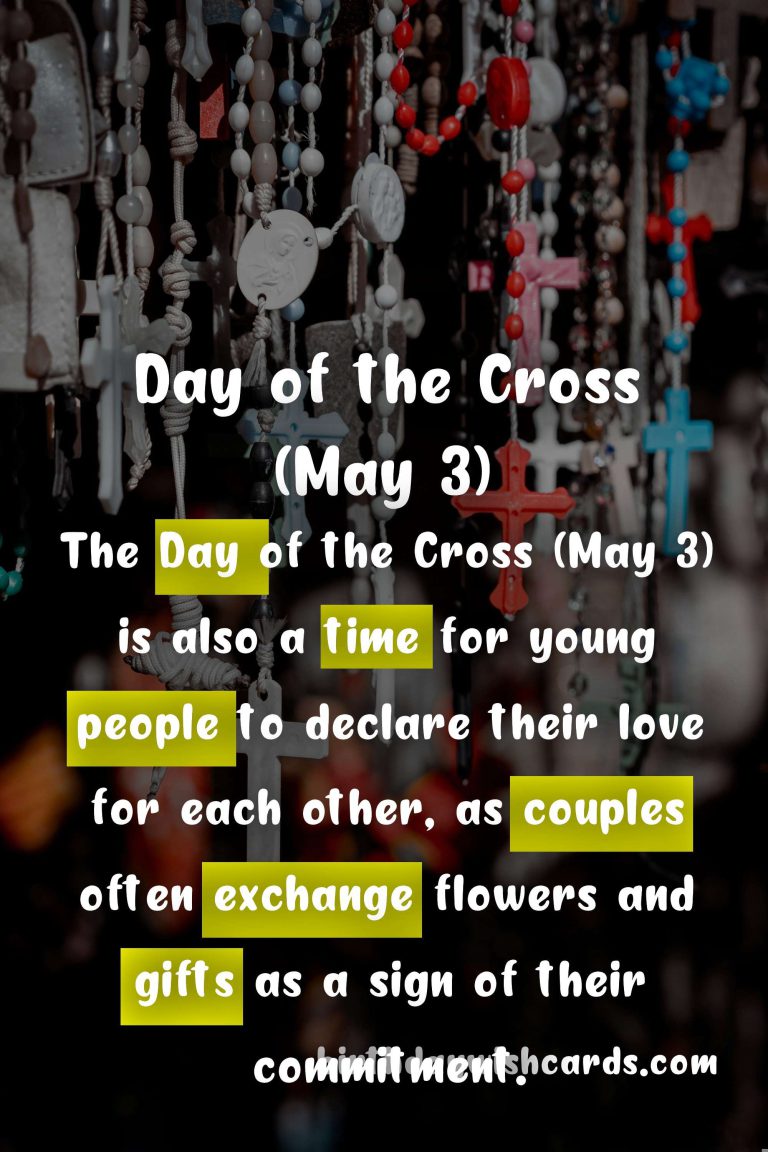 The Day of the Cross (May 3) is a significant cultural and religious holiday celebrated in many countries around the world. It is an occasion that brings people together to honor and remember the Holy Cross, a symbol of hope, faith, and new beginnings. In this blog post, we will take a closer look at the history and traditions associated with this special day, and how it is celebrated in different parts of the world. The origins of the Day of the Cross (May 3) date back to the 4th century when Saint Helena, the mother of Constantine the Great, is said to have discovered the True Cross upon which Jesus was crucified. Since then, the Holy Cross has been venerated by Christians across the globe and has become an important symbol in their faith. The Day of the Cross (May 3) is also known as the Feast of the Finding of the Holy Cross and the Flower Festival in some countries. In many Catholic and Orthodox churches, the Day of the Cross (May 3) is a feast day of obligation, meaning it is a mandatory day of worship and celebration. In some parts of Spain and Latin America, the Day of the Cross (May 3) is a public holiday and is celebrated with parades, fireworks, and traditional dances. The Day of the Cross (May 3) is also popularly known as the ‘Day of the Cross’ due to the traditional custom of decorating crosses with flowers and performing processions in honor of the Holy Cross. In Mexico, the Day of the Cross (May 3) is celebrated with colorful flower markets, altars adorned with candles and images of the Virgin Mary, and traditional food and music. The Day of the Cross (May 3) is also a time for young people to declare their love for each other, as couples often exchange flowers and gifts as a sign of their commitment. In the Philippines, the Day of the Cross (May 3) is celebrated with a special mass in honor of the Holy Cross, followed by a procession and the blessing of food, candles, and rosaries. Many people around the world also mark the Day of the Cross (May 3) by wearing red or white flowers, the colors associated with the Holy Cross. The Day of the Cross (May 3) is not only a religious holiday but a cultural one as well, as it is a time for people to come together, celebrate, and share in their traditions and beliefs.