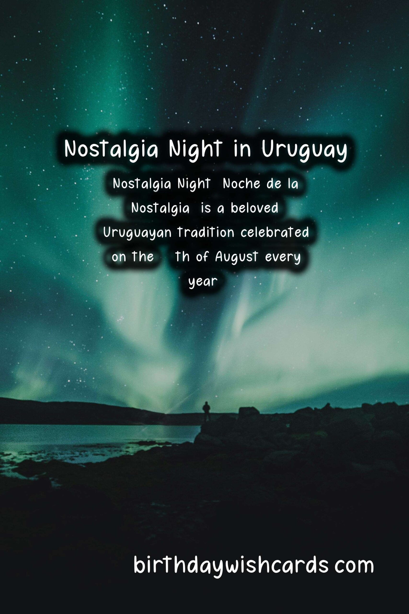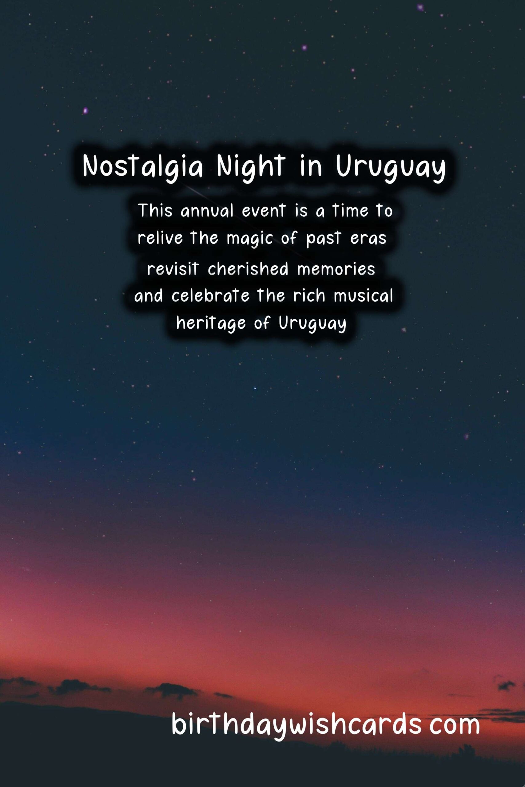 Sentences: Sentences related to Nostalgia Night (Noche de la Nostalgia) – August 24: 1. Nostalgia Night (Noche de la Nostalgia) is a beloved Uruguayan tradition celebrated on the 24th of August every year. 2. This annual event is a time to relive the magic of past eras, revisit cherished memories, and celebrate the rich musical heritage of Uruguay. 3. The roots of Nostalgia Night go back to the 1970s, when a group of radio DJs started playing classic songs from the 60s and 70s on the night of August 24th. 4. From tango to rock and roll to traditional Uruguayan music, Nostalgia Night features a diverse range of genres and styles that are sure to bring back fond memories and emotions. 5. It’s not only about the music, but Nostalgia Night is also about the vibrant and lively atmosphere, with people taking to the streets to dance and sing the night away. 6. Many bars, restaurants, and clubs in Uruguay host Nostalgia Night parties, with special menus and drinks inspired by the past. 7. Nostalgia Night is a great opportunity to dress up in retro fashion and spend the night with friends and loved ones, creating new memories to cherish in the years to come.