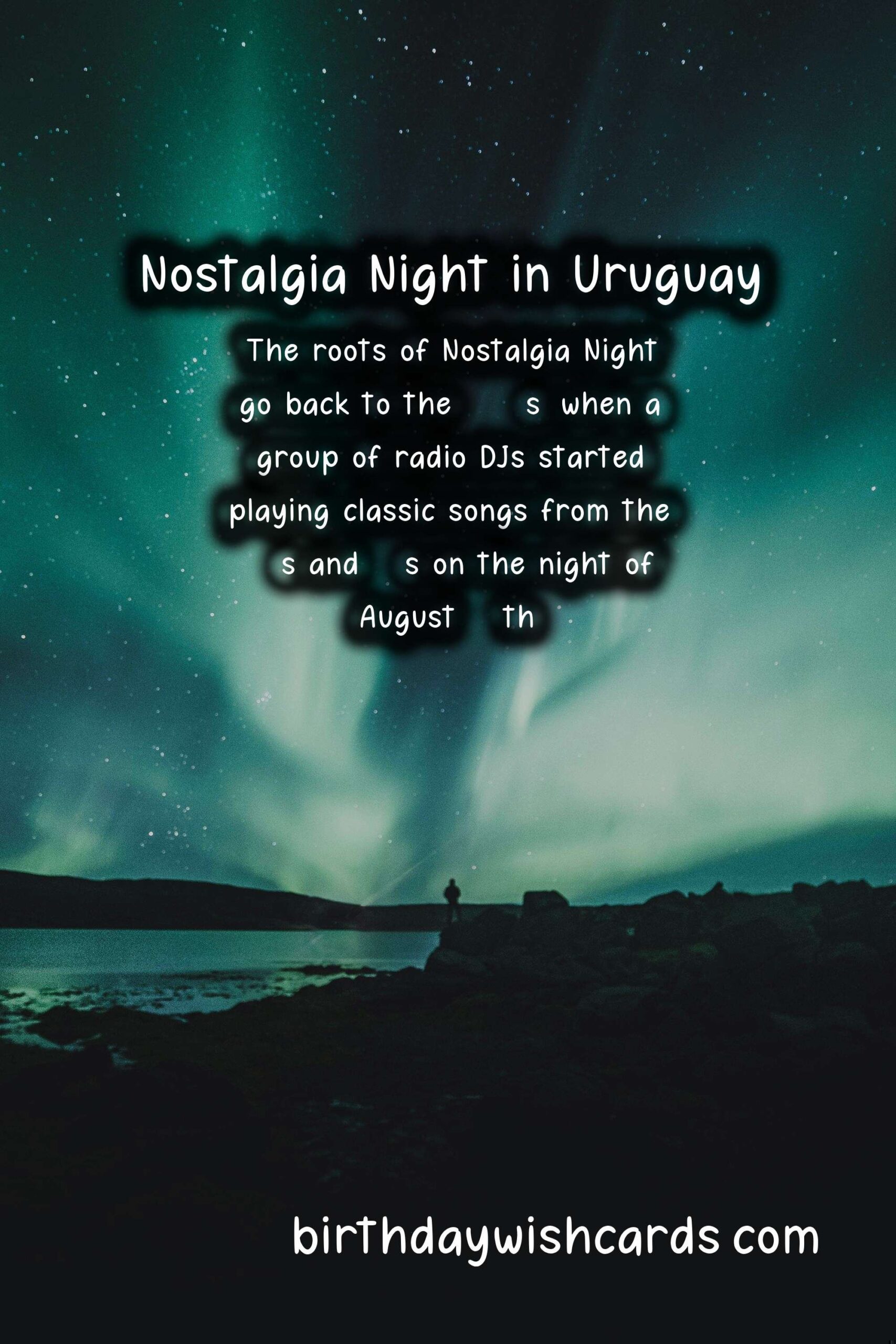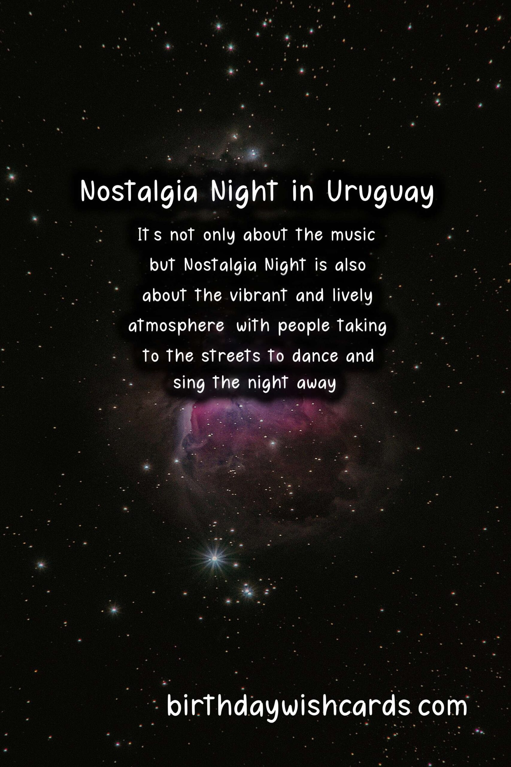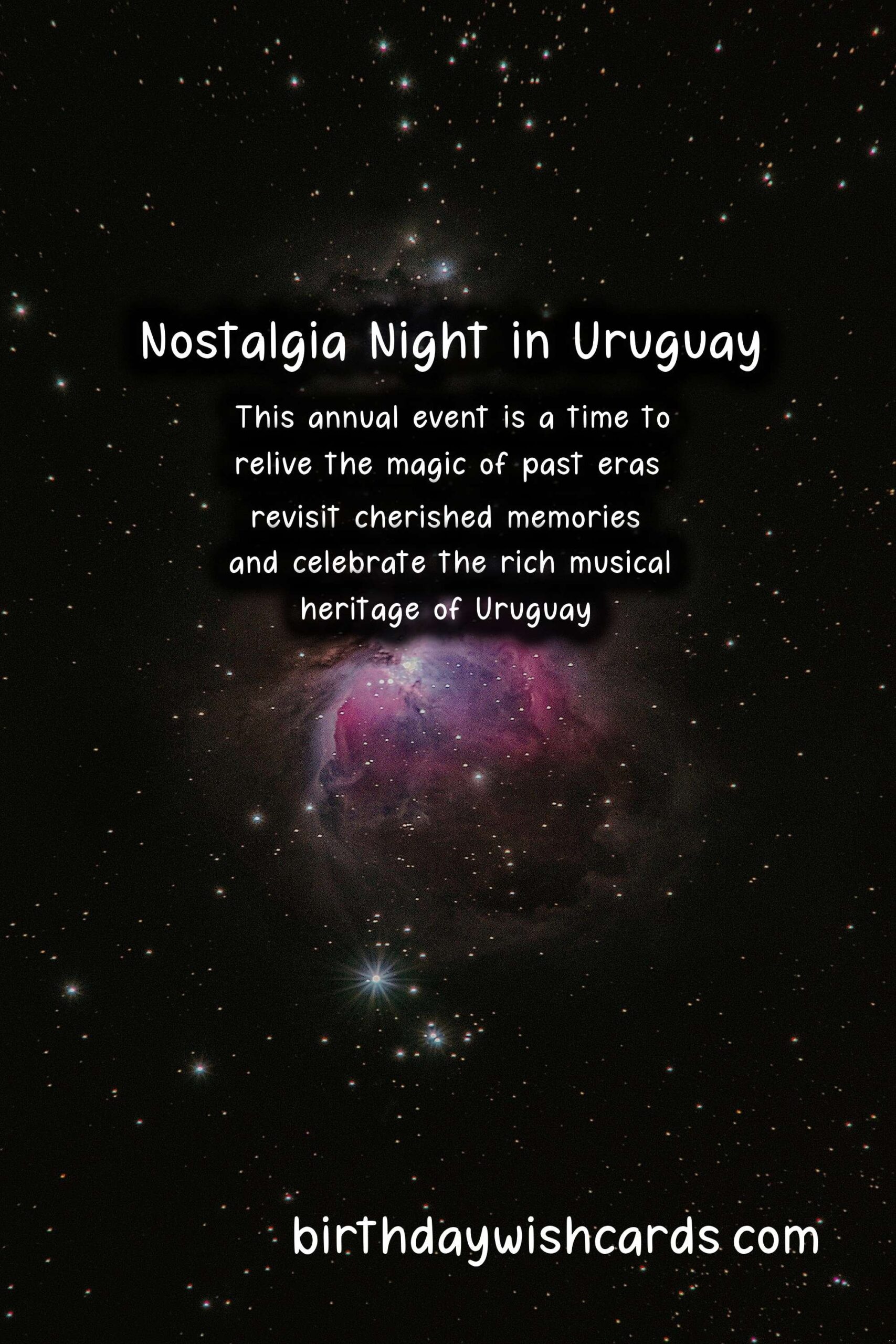 Nostalgia Night (Noche de la Nostalgia) is a beloved Uruguayan tradition celebrated on the 24th of August every year. This annual event is a time to relive the magic of past eras, revisit cherished memories, and celebrate the rich musical heritage of Uruguay. The roots of Nostalgia Night go back to the 1970s, when a group of radio DJs started playing classic songs from the 60s and 70s on the night of August 24th. From tango to rock and roll to traditional Uruguayan music, Nostalgia Night features a diverse range of genres and styles that are sure to bring back fond memories and emotions. It’s not only about the music, but Nostalgia Night is also about the vibrant and lively atmosphere, with people taking to the streets to dance and sing the night away. Many bars, restaurants, and clubs in Uruguay host Nostalgia Night parties, with special menus and drinks inspired by the past. Nostalgia Night is a great opportunity to dress up in retro fashion and spend the night with friends and loved ones, creating new memories to cherish in the years to come.