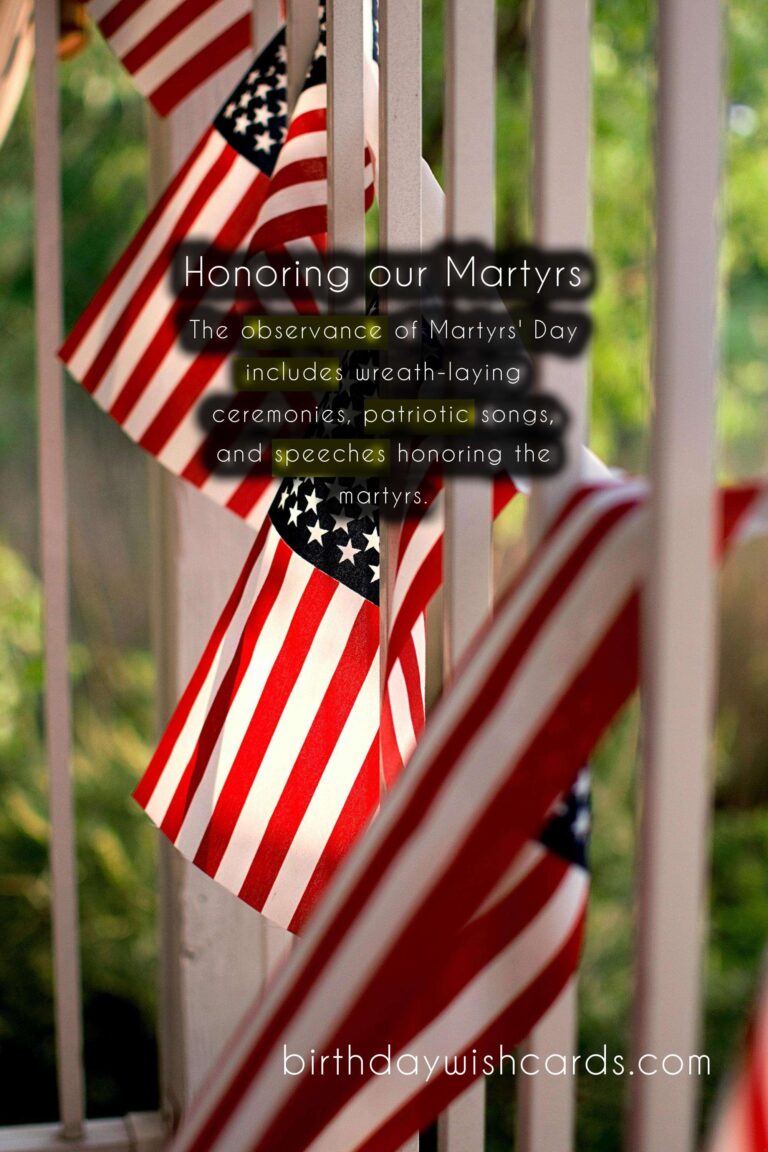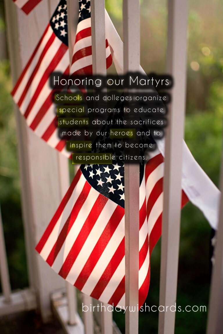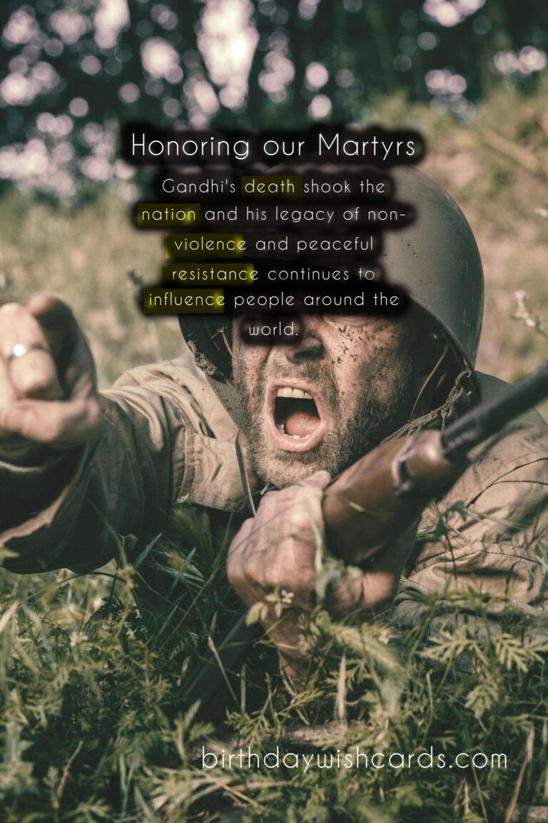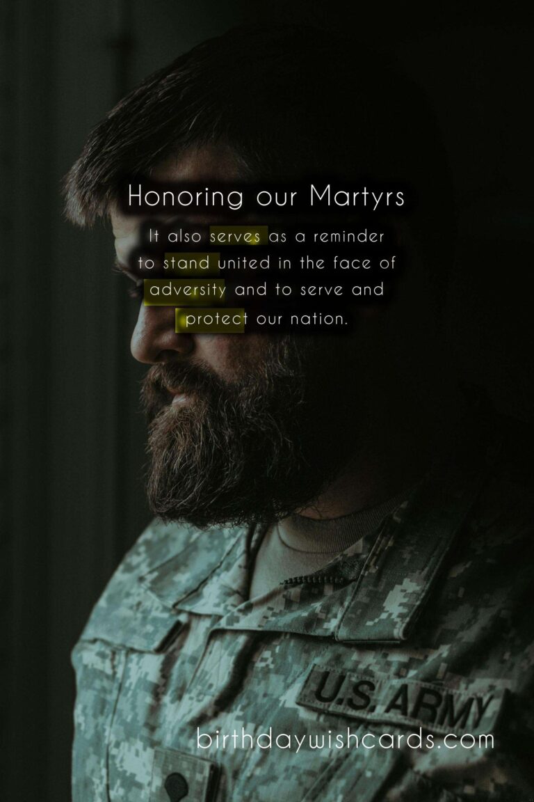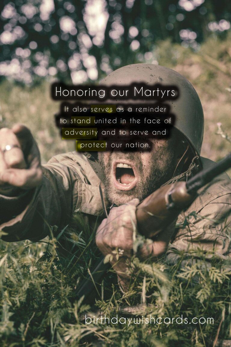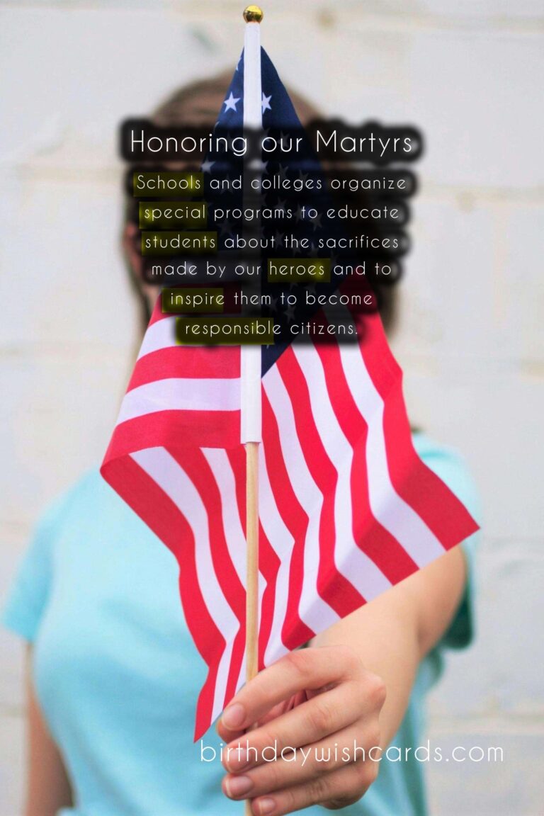 Featured ImageEvery year on May 6th, we observe Martyrs’ Day to honor and pay tribute to those who have sacrificed their lives for the greater good of the nation. This day holds great significance as it serves as a reminder of the courage and bravery displayed by our martyrs. It is a day to remember the sacrifices made by our heroes in the face of adversity and to honor their legacy that continues to inspire generations. Here is a guide to understanding and commemorating Martyrs’ Day. Martyrs’ Day is celebrated in many parts of the world to honor those who gave their lives for their country. On this day, we also pay tribute to soldiers who fought in wars and lost their lives in the line of duty. The history of Martyrs’ Day dates back to the death anniversary of the father of modern Turkey, Mustafa Kemal Atatürk, who passed away on May 6th, 1938. In India, Martyrs’ Day is marked as a national holiday and is observed in the memory of Mahatma Gandhi, who was assassinated on this day in 1948. Gandhi’s death shook the nation and his legacy of non-violence and peaceful resistance continues to influence people around the world. Martyrs’ Day is a day to reflect on the sacrifices made by our martyrs and to remember their contributions to our nation’s freedom and progress. The observance of Martyrs’ Day includes wreath-laying ceremonies, patriotic songs, and speeches honoring the martyrs. Schools and colleges organize special programs to educate students about the sacrifices made by our heroes and to inspire them to become responsible citizens. Many organizations and institutions also conduct blood donation camps on this day to honor the martyrs who shed their blood for the nation. Martyrs’ Day reminds us to be grateful for the freedom and rights we enjoy today, and to honor those who made it possible. It also serves as a reminder to stand united in the face of adversity and to serve and protect our nation. On this day, let us remember the words of Mahatma Gandhi: ‘The true measure of any society can be found in how it treats its most vulnerable members.’ Martyrs’ Day is not only about honoring the past, but also about recognizing and supporting the present and future martyrs who continue to serve and protect our country. So let us take a moment on this day to remember and honor the brave souls who have sacrificed their lives for the greater good of our nation. May their courage and sacrifice continue to inspire us to strive for a better tomorrow. Jai Hind! Remembering the brave: A Guide to Martyrs' Day - May 6thRemembering the brave: A Guide to Martyrs' Day - May 6thRemembering the brave: A Guide to Martyrs' Day - May 6thRemembering the brave: A Guide to Martyrs' Day - May 6thRemembering the brave: A Guide to Martyrs' Day - May 6thRemembering the brave: A Guide to Martyrs' Day - May 6thRemembering the brave: A Guide to Martyrs' Day - May 6thRemembering the brave: A Guide to Martyrs' Day - May 6thRemembering the brave: A Guide to Martyrs' Day - May 6thRemembering the brave: A Guide to Martyrs' Day - May 6th