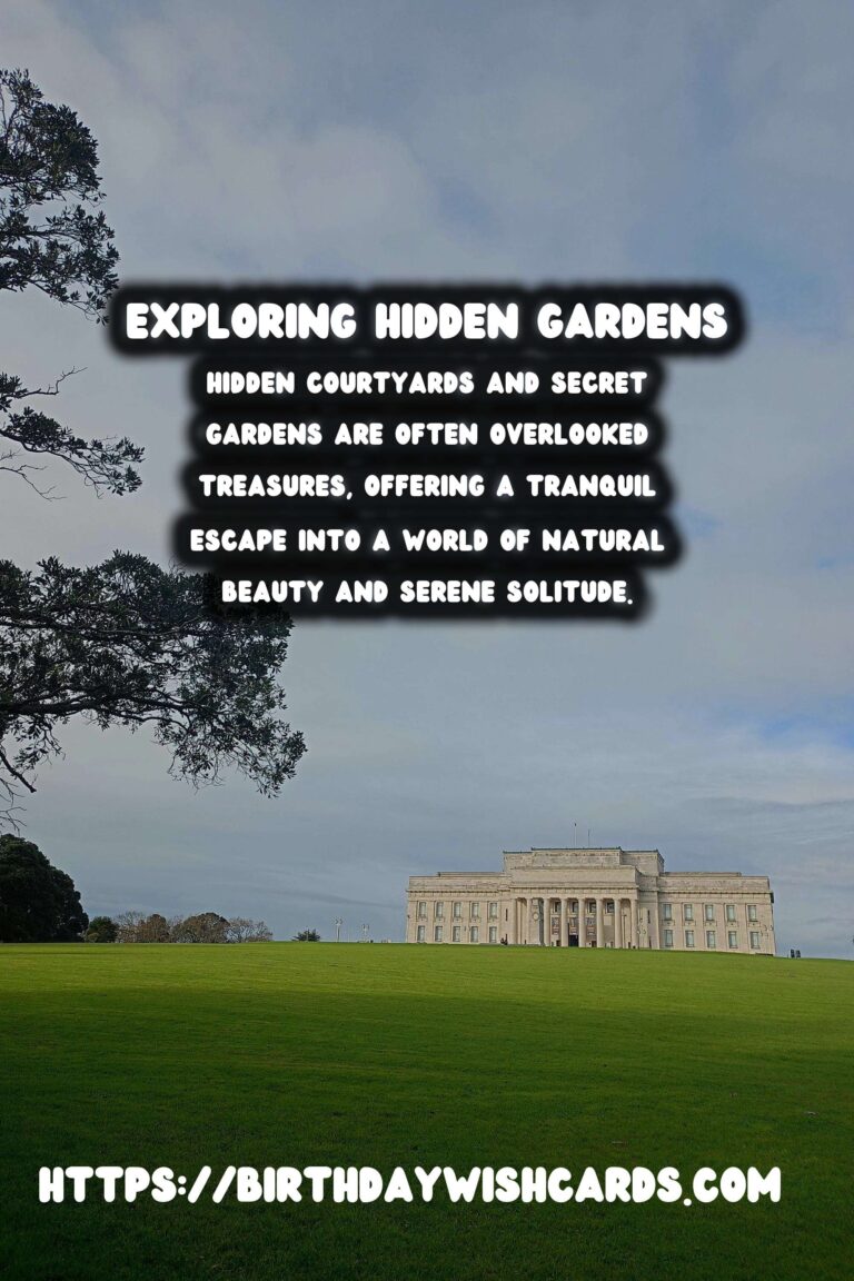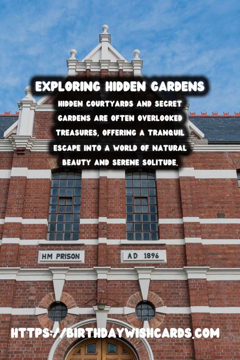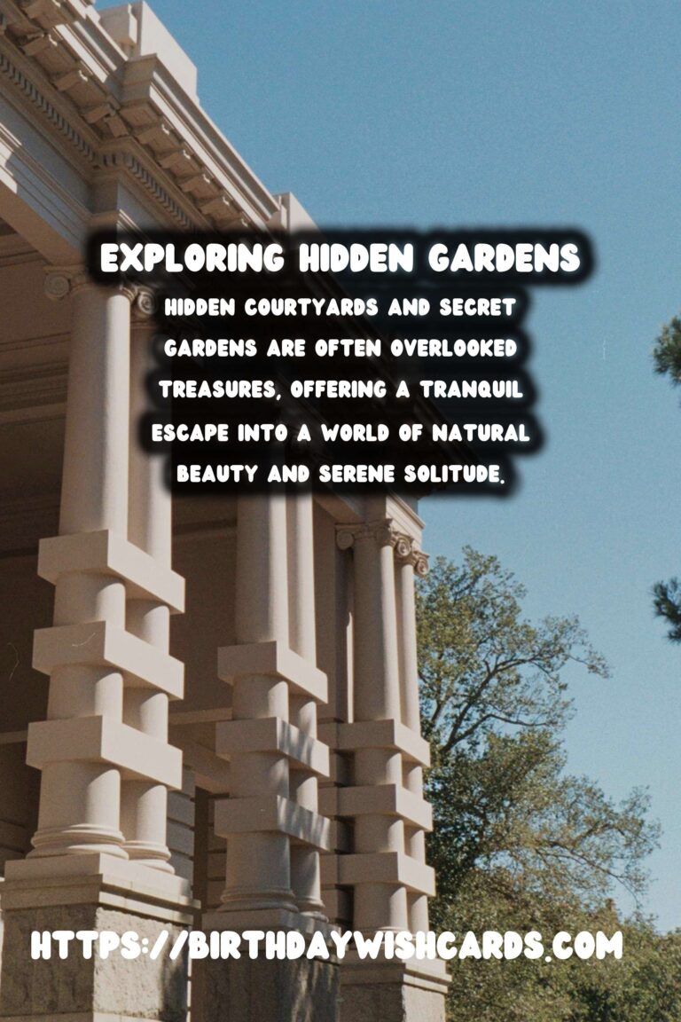 Hidden courtyards and secret gardens are often overlooked treasures, offering a tranquil escape into a world of natural beauty and serene solitude. Imagine sitting by a fountain in a sun-dappled courtyard, surrounded by the scent of jasmine and the gentle sound of water.