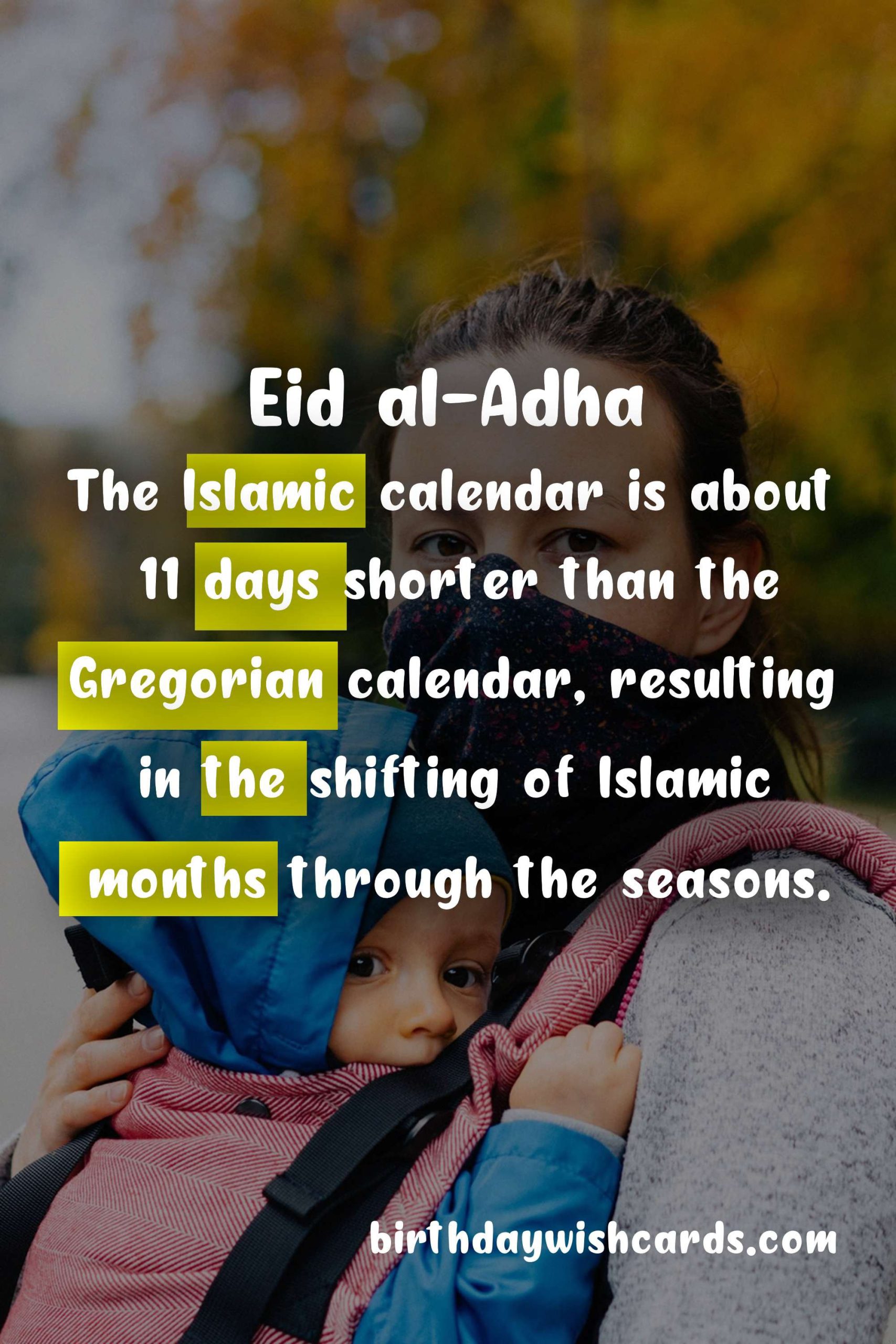 The Islamic calendar is a lunar calendar, meaning it is based on the cycles of the moon. This is different from the Gregorian calendar that follows the cycles of the sun. As a result, the dates of Islamic holidays change each year, as the lunar months are shorter than the solar months. In addition to that, the Islamic calendar is also about 11 days shorter than the Gregorian calendar, meaning that Islamic months will gradually shift through the seasons. This is why Eid al-Adha falls on a different date every year on the Gregorian calendar.