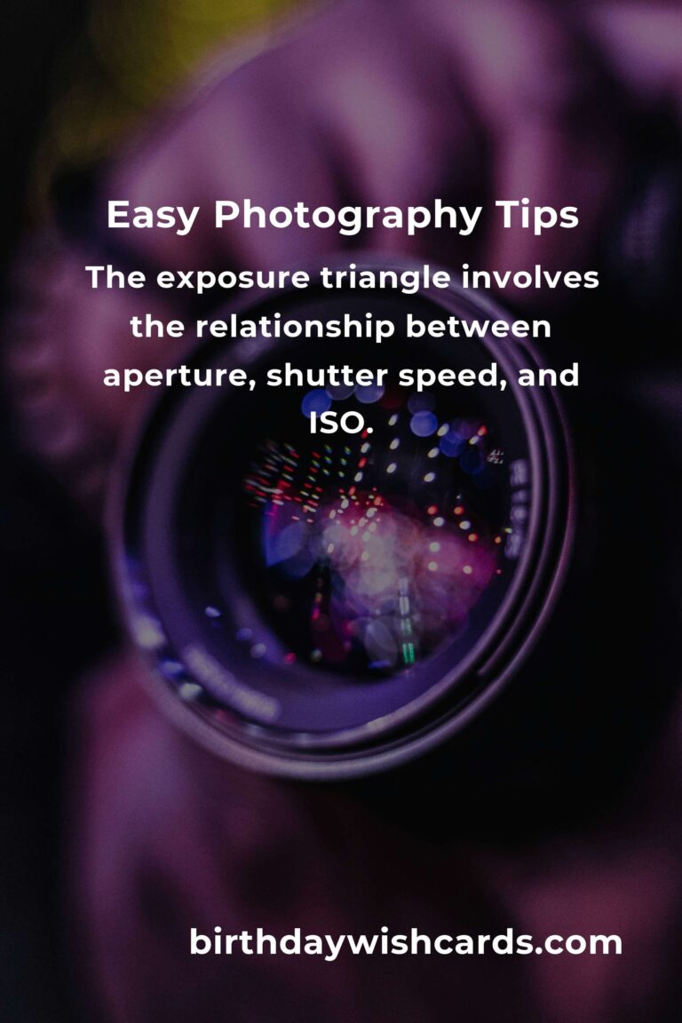 The exposure triangle is a key concept in photography that involves the relationship between three elements: aperture, shutter speed, and ISO. Aperture controls the amount of light entering the lens, shutter speed controls the duration the sensor is exposed to light, and ISO determines the sensor’s sensitivity to light. Understanding how these elements work together will allow you to achieve the correct exposure for your images. Practice adjusting these settings in different lighting conditions to see how they impact your photos.