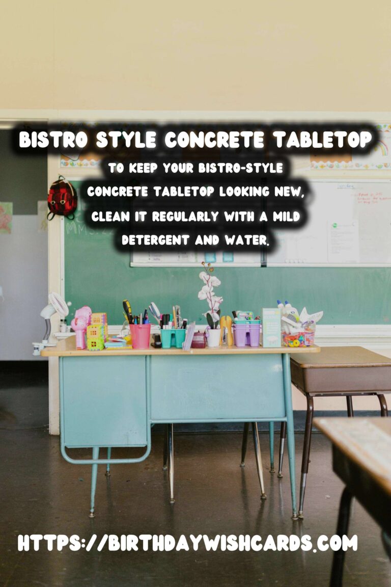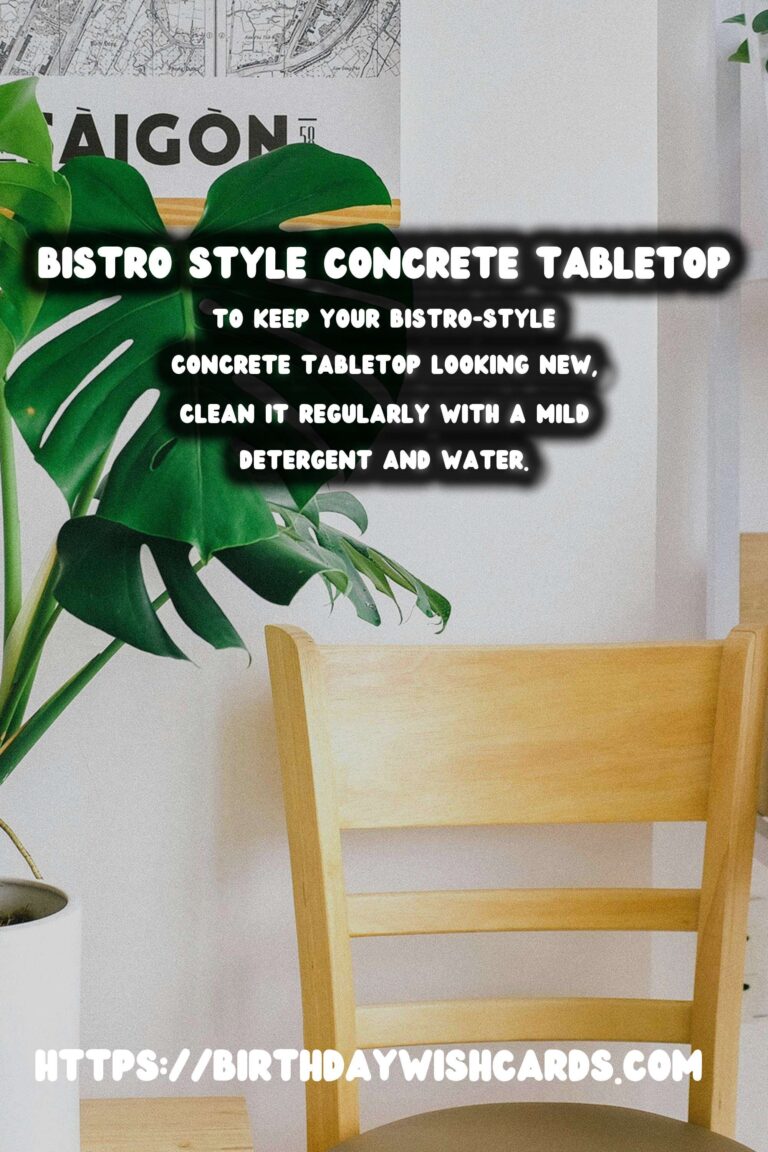 To keep your bistro-style concrete tabletop looking new, clean it regularly with a mild detergent and water. Avoid harsh chemicals that can damage the sealer. Reseal the tabletop every few years to maintain its appearance and durability.