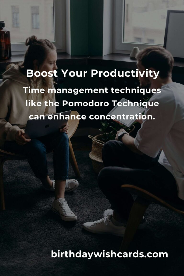 Time management is a crucial aspect of productivity. Techniques such as the Pomodoro Technique, where work is done in focused bursts with short breaks in between, can significantly enhance concentration and output. Additionally, setting clear goals and prioritizing tasks using methods like the Eisenhower Box can help streamline your workflow.